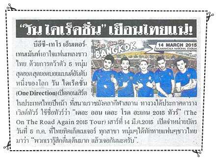 อีกไม่ถึงอาทิตย์ ไดเร็คชั่นเนอร์ชาวไทยก็จะได้พบกับหนุ่มๆ วันไดเร็คชั่นทั้ง 5 แล้ว วันนี้เราจึงหยิบเอาภาพบรรยากาศ แฟนข่าวจากรายการเรื่องเล่าเช้านี้และโตโยต้าบินเหินฟ้าชมคอนเสิร์ต ของหนุ่มๆ วันไดเร็คชั่นไกลถึงประเทศญี่ปุ่น และข้อความทักทายแฟนๆ ชาวไทย